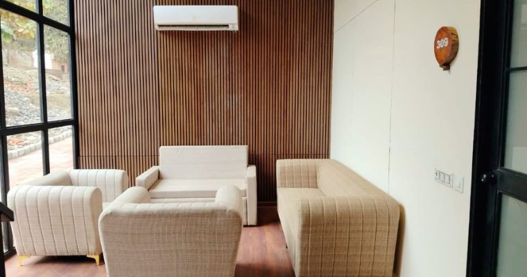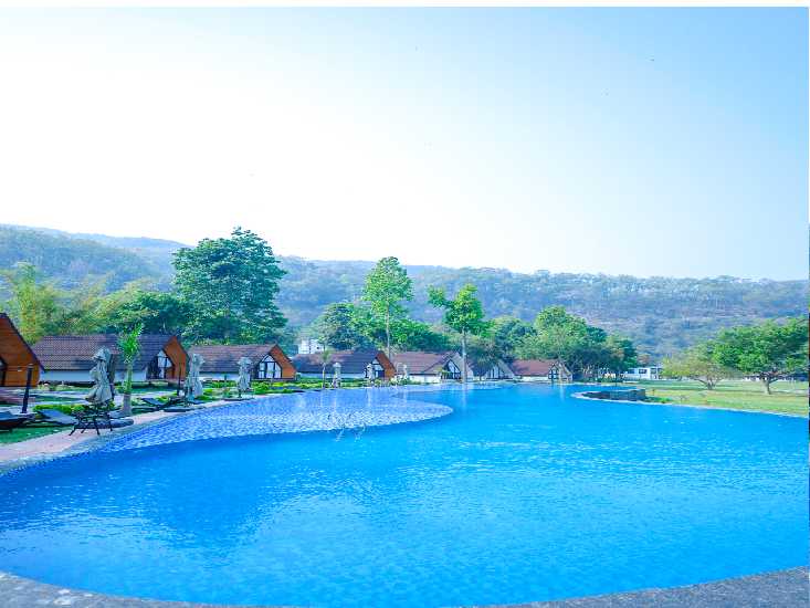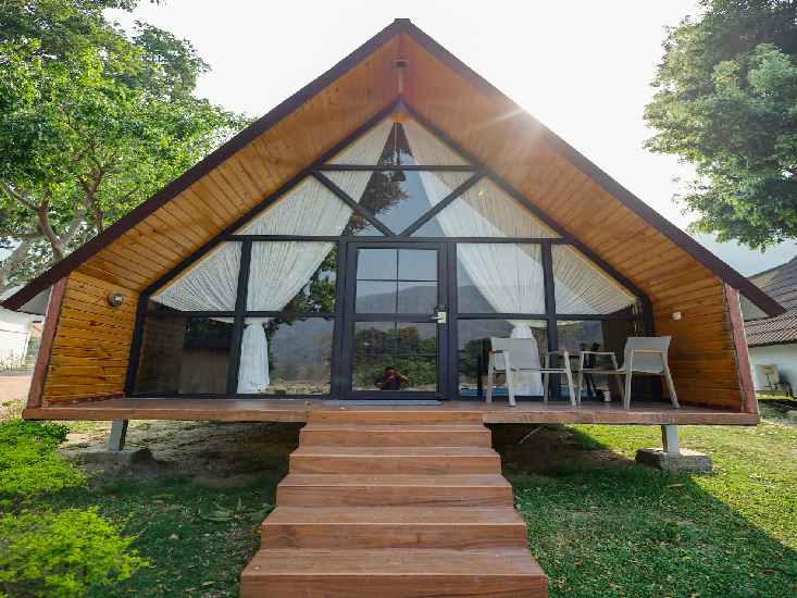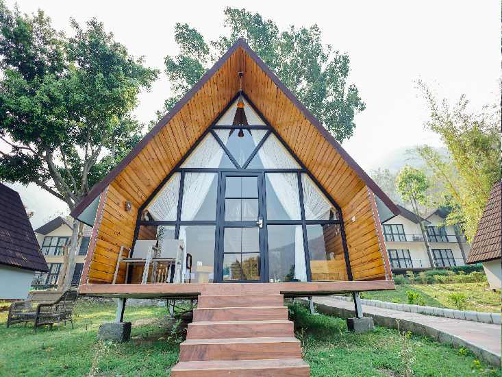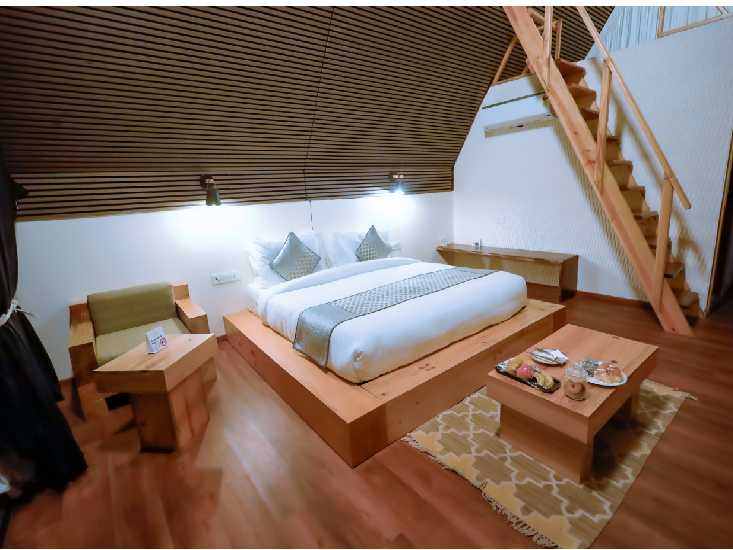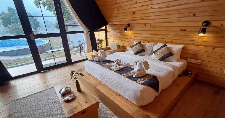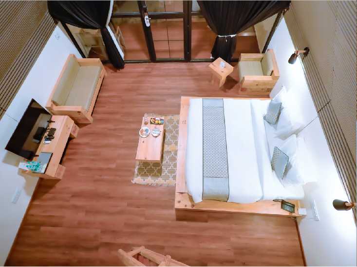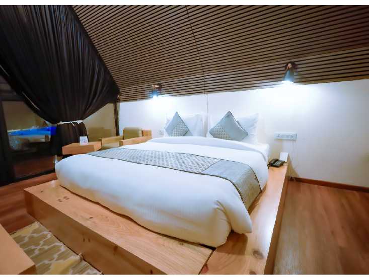 Immerse yourself in nature's embrace in the Pine Wood Cottage Rooms, featuring king-size beds and a Machan for kids, providing a touch of rustic luxury amidst the natural surroundings.